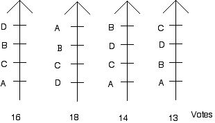 Note that since we have rankings for all of the candidates by every voter, we can carry out calculations for "run-off" elections that don't require voters to go to the polls another time. For example, in a two-way election involving only candidates D and A we would conclude that D gets 16 plus 14 plus 13 votes to A's 18 votes and that in such a two-way race D would win.